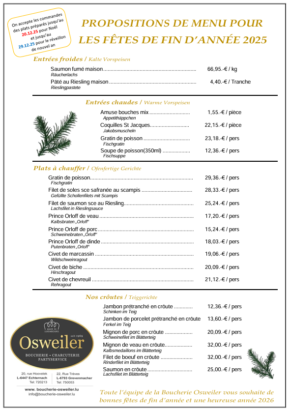 Déi ganz Equipe vun der Boucherie Osweiler wënscht Iech schéin Chrëschtdéeg an éen Gesond Joër 2026